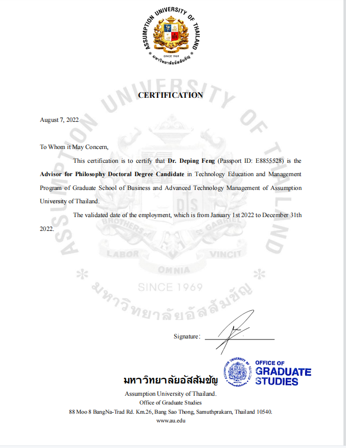 近日,经泰国易三仓大学研究生院学术委员会审议通过,我校bv伟德国际体育官方网站冯德平副教授受聘为该校研究生院博士研究生指导教师。冯德平副教授具有博士学位,毕业论文指导经验丰富。冯德平副教授的受聘,突出了国外院校对我校教师学术能力和科研水平的认可,有助于我校外语学科集群师资队伍建设和高层次人才培养。